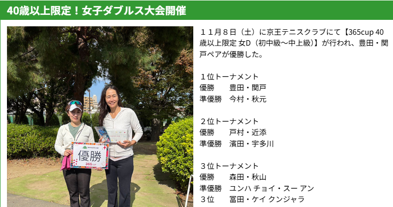 11月8日(土)に京王テニスクラブにて【365cup 40歳以上限定 女D(初中級〜中上級)】が行われ、豊田・関戸ペアが優勝した。