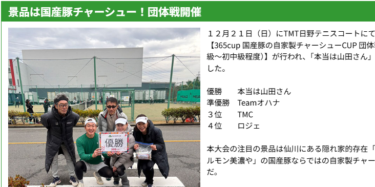 12月21日(日)にTMT日野テニスコートにて【365cup 国産豚の自家製チャーシューCUP 団体戦(初級~初中級程度)】が行われ、「本当は山田さん」が優勝した。