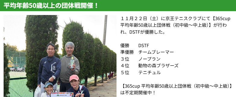 11月22日(土)に京王テニスクラブにて【365cup 平均年齢50歳以上団体戦(初中級〜中上級)】が行われ、DSTFが優勝した。