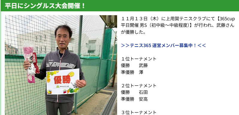 1人3500円で1日試合できる tennis365団体戦 「初中~中級程度」が開催され1位トーナメントでは「ツバサ」が優勝を果たした。