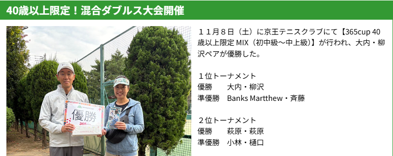 11月8日(土)に京王テニスクラブにて【365cup 40歳以上限定 MIX(初中級〜中上級)】が行われ、大内・柳沢ペアが優勝した。